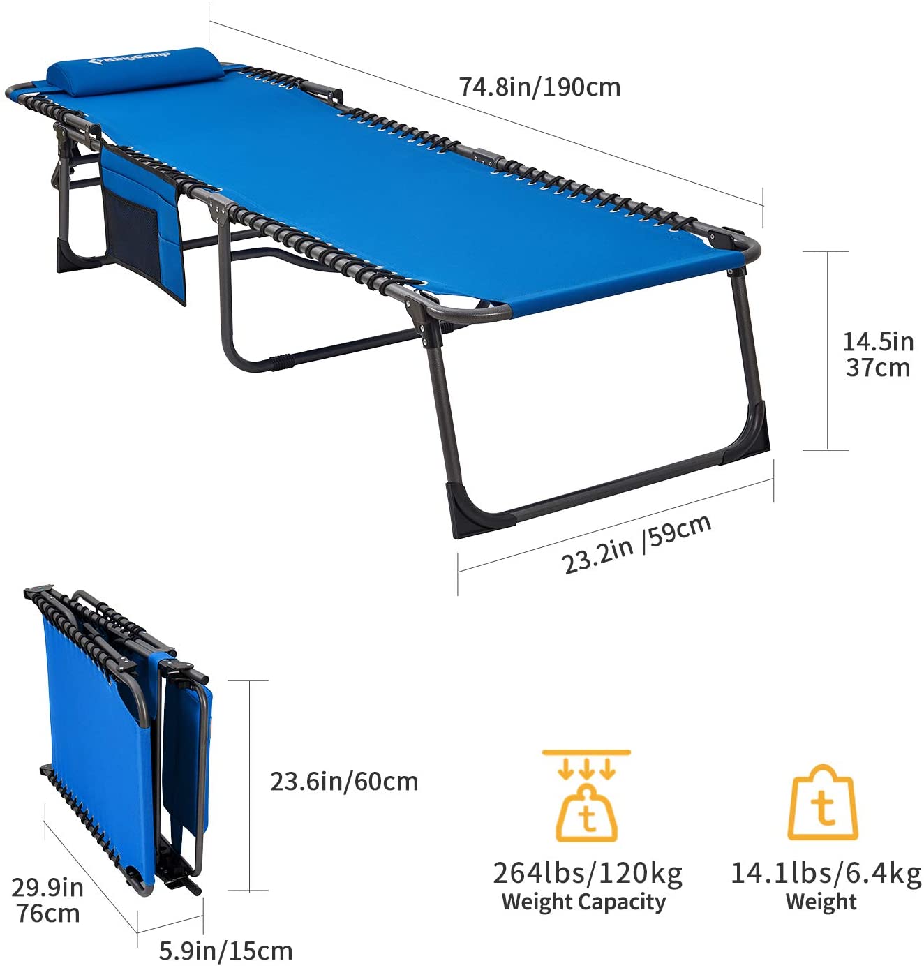 - 【Sturdy and Comfy】The dimension of the outdoor lounge chair is 75 x 23.2 x 13.3 inches, fits people up to 6.2 feet. Packed size: 29.9 x 5. 9 x 23.6 inches, weight 14.1 lbs. Tri-fold design is easy to store and carry. Constructed of anodized steel and durable 600D oxford fabric suspended by double bungee system, footrest cover and foot pads make it slip resistant on hard ground surfaces. Heavy duty steel frame, supports up to 120kg /264 lbs.