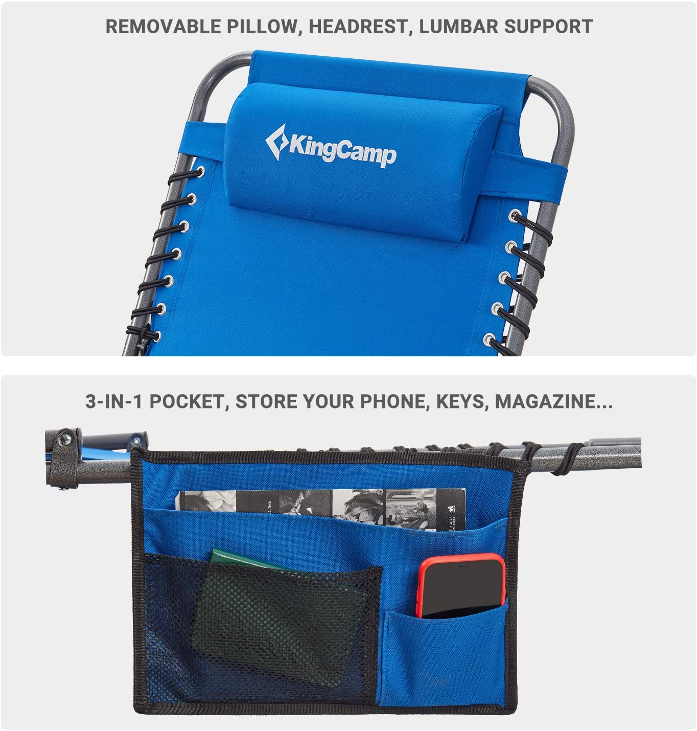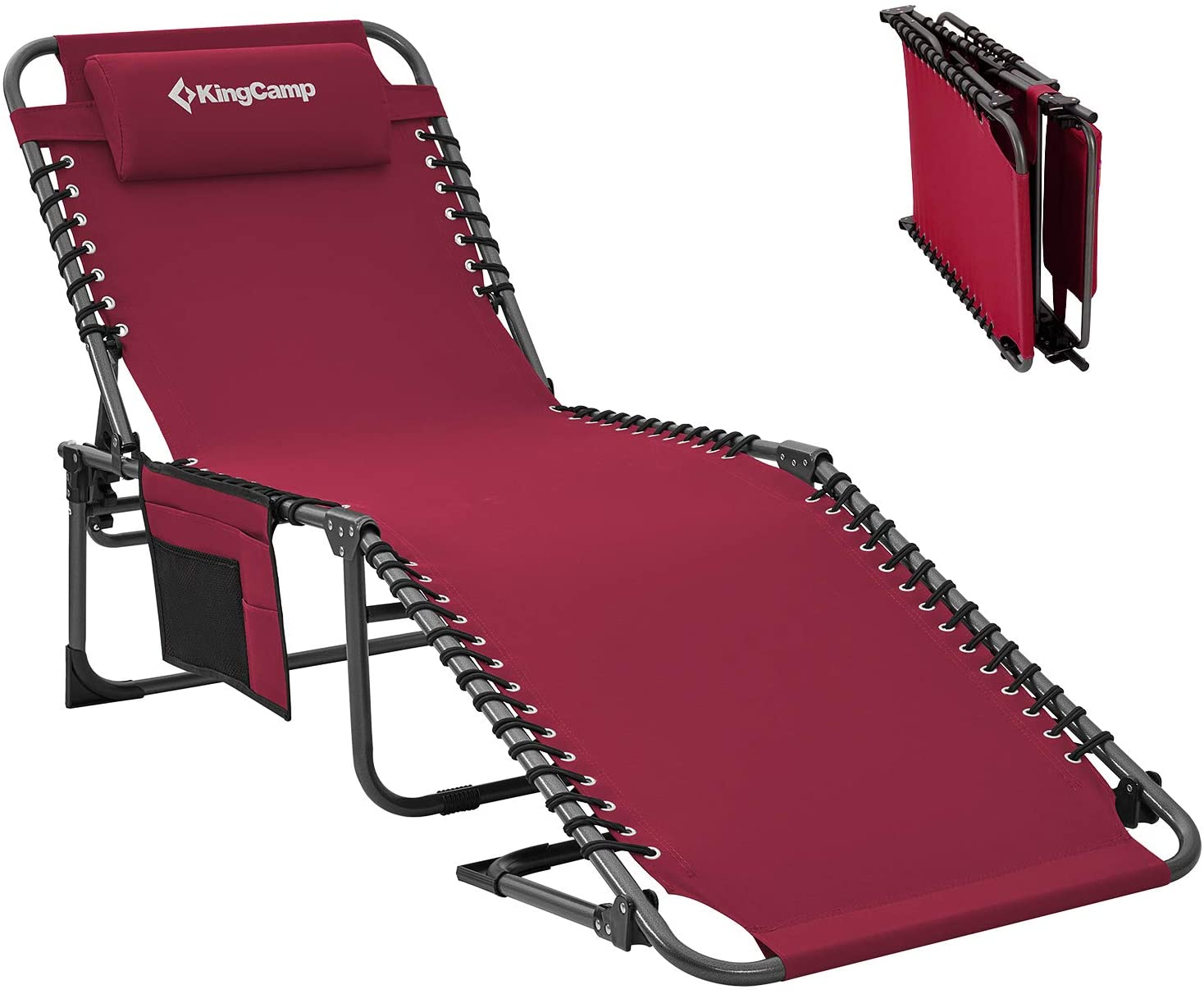 - 【4-Fold Lounge Chair】The chaise lounge chairs with triangle locking system, which allows you to lock the chair in different positions, you can sit up, recline or lay flat. Ergonomic design to reduce your muscle tension and stress,perfect balance between firmness and softness. Lays completely flat as a camping cot.