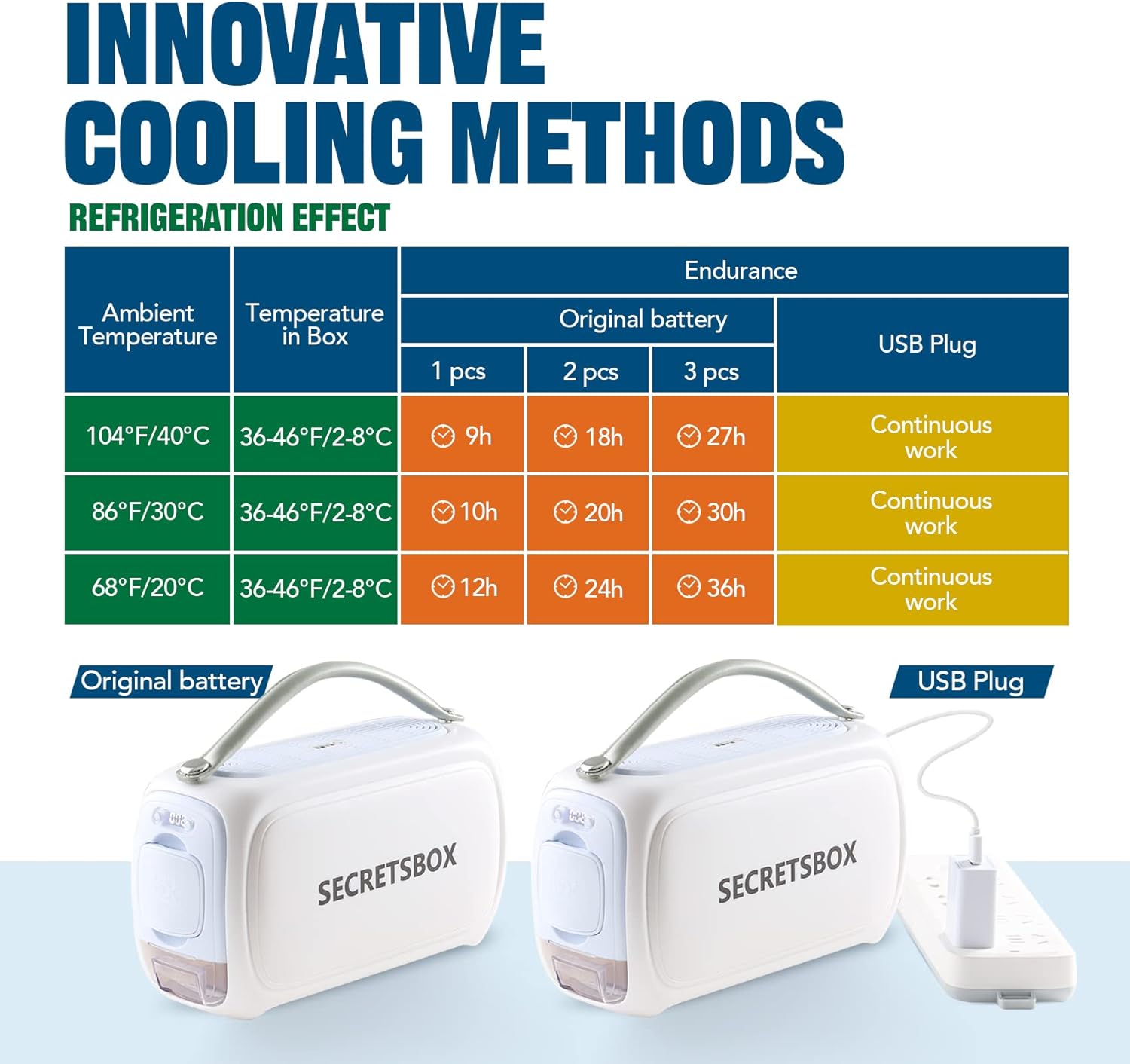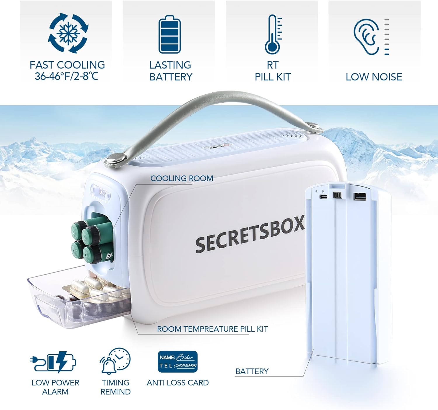 - 【Long Time Endurance and Power Alarming】The new patented diabetic insulin cooler travel case box contains 2 original rechargeable batteries. 1 battery can last 9-12 hours in summer. When the TSA approved insulin cooler machine is low on power, the cooler box will intermittently beep to remind you to charge or replace the battery. In addition, the battery also can be used as power bank to charge other electronic device