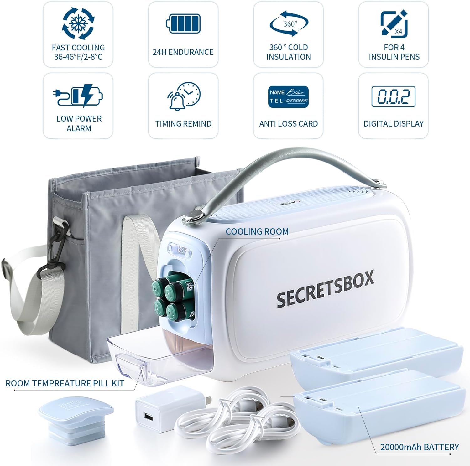 - 【Portable Handbag and Multifunctional Digital Display 】The new designed insulin cooing case equipped with digital display that shows the inner temperature in real time and remaining power, also allow you to set a alarming to remind you to eat half an hour later after insulin injection. Anti-loss card,you can put your information on it. Hand strap allow you to take it up and down. Portable bag can be carried on shoulder or back. Fashionable in appearance and useful for privacy protection